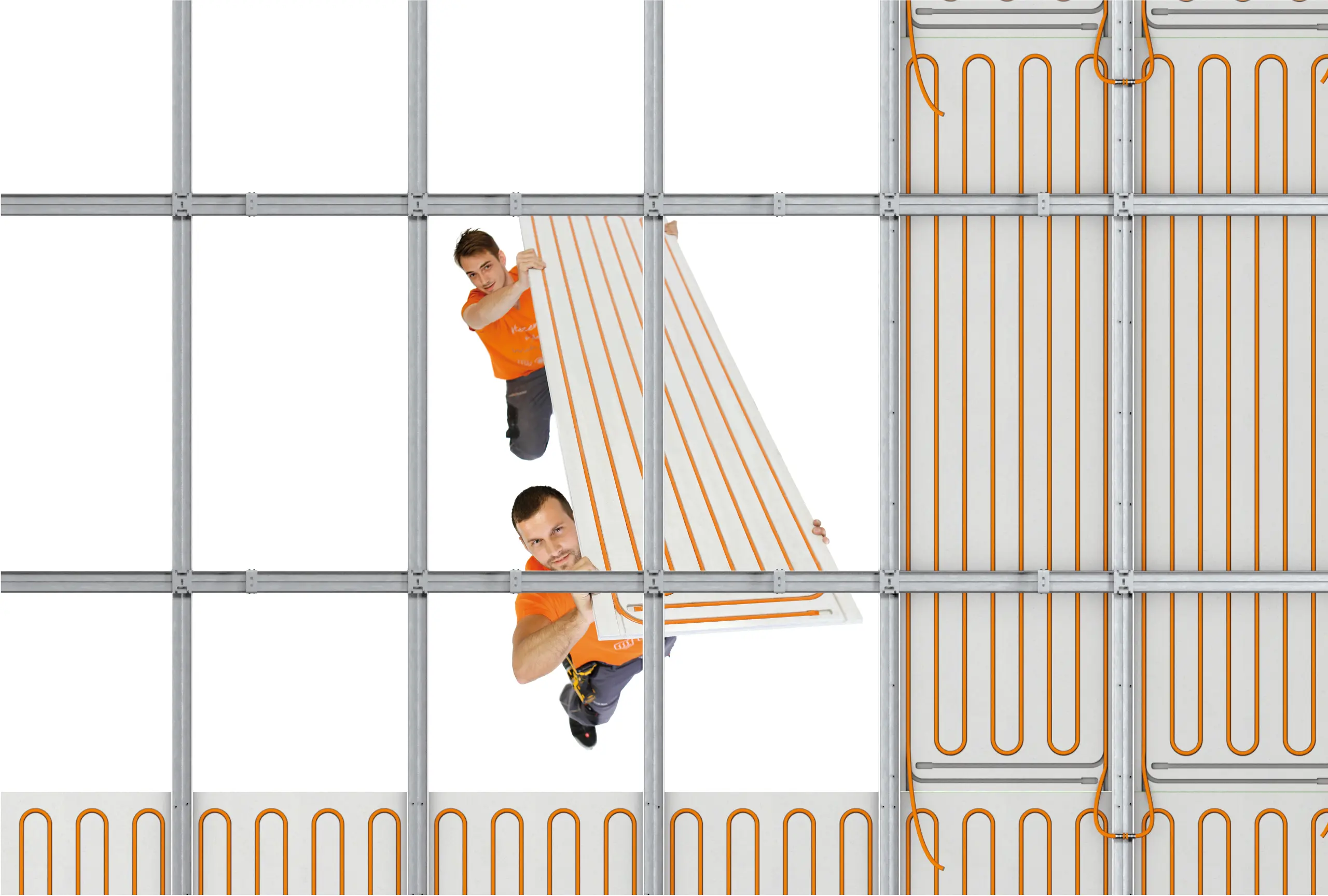 Le système ModulCeiling est composé de panneaux de fibres de gypse de 18 mm de différentes dimensions dans lesquels sont intégrés les tuyaux multicouche VarioModular 11,6 x 1,5 mm avec un espacement de 75 mm.