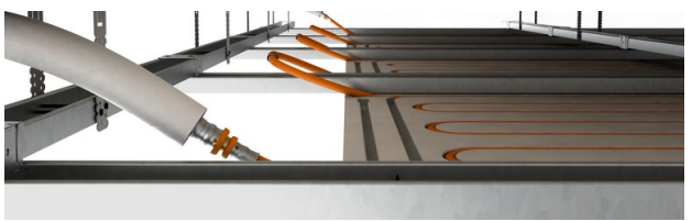 Le système de chauffage/rafraîchissement au plafond pour cloisons sèches ModulCeiling est un système hydraulique, il permet le chauffage grâce à la circulation d’eau chaude à basse température et la fraicheur grâce à la circulation d’eau fraiche.