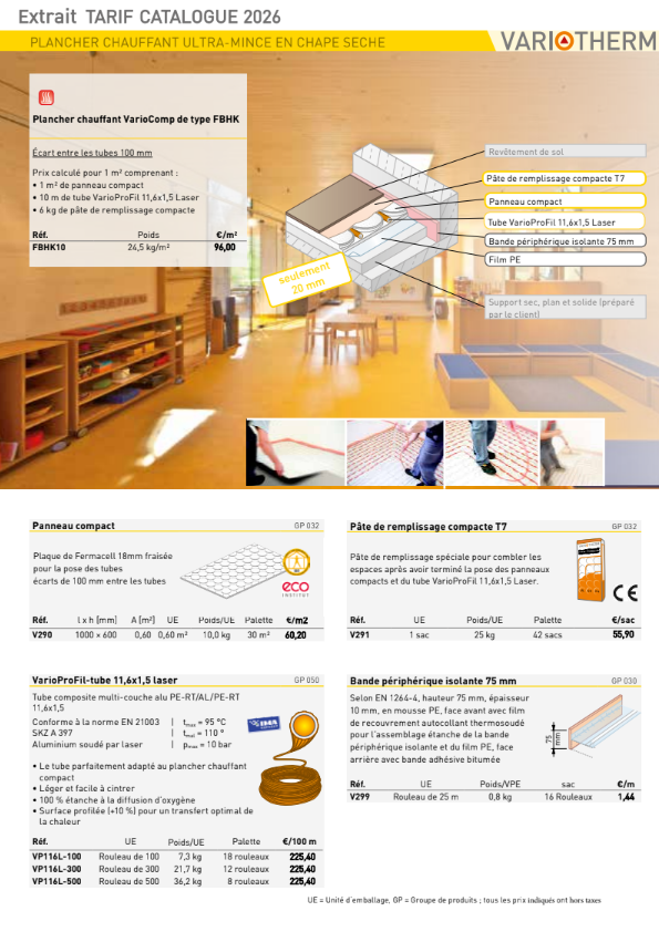 VarioComp est toujours proposé en première intention par rapport aux solutions pour les murs et plafonds car il couvre la totalité de la surface du sol (hors cuisine, ilot central, placards, douches, baignoires…) ce qui garantit les meilleures performances en terme de confort