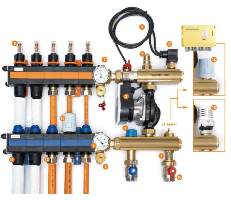 Le VARIOMANIFOLD 5.0 à Circulateur a été spécialement conçu à cet effet. Il permet par exemple d’associer des radiateurs existants fonctionnant à une température de départ d’environ 60°C avec un plancher chauffant VarioComp basse température économe en énergie